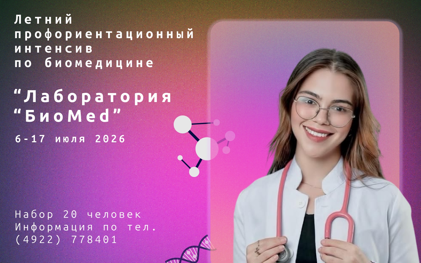 Приглашаем обучающихся 7-10 классов на летний профориентационный интенсив по биомедицине «Лаборатория «БиоMed»
